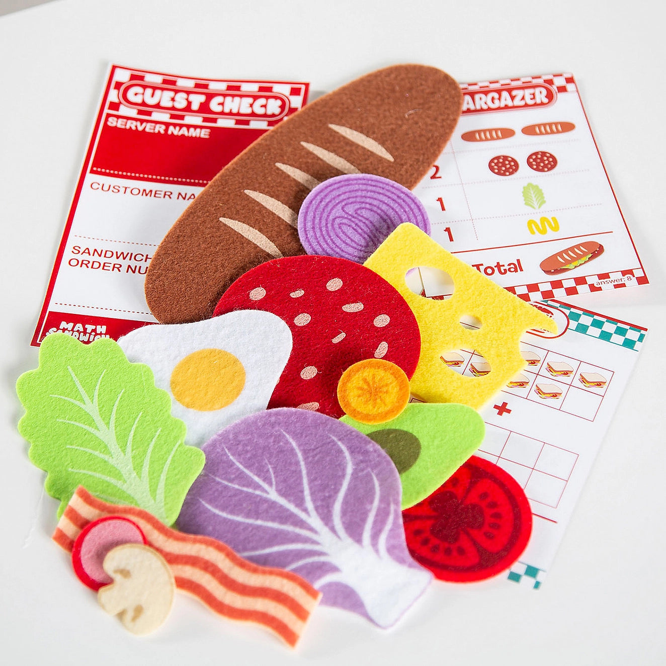 This deliciously educational game lets children explore mathematical concepts while they build sandwiches from durable felt food pieces. Kids will practice counting and adding as they follow the menu cards to place colorful vegetable, meat and cheese items on each sandwich. With over 100 food pieces, they can experiment with a wide variety of sandwich combinations, counting as they go!