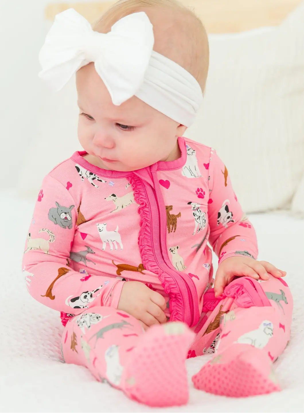 Baby Girls Pink Puppy Playtime Bamboo Viscose Footed Ruffle One Piece Pajama This ruffled sleeper is soft and cozy on baby's skin, with precious ruffles that will bring a smile to your face. A two-way zipper makes changing a breeze, so everyone can get the best night's rest. Foldover mitts on Newborn and 0-3m sizes. Made from our brand new SoftSnooze™ bamboo viscose! Designed to grow with your little one, SoftSnooze™ bamboo viscose fabric is super snuggly, breathable, and made for sensitive skin. Perfect for keeping cozy in the winter yet cool in the summer.