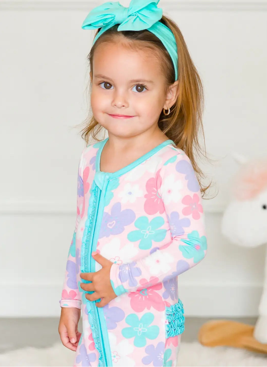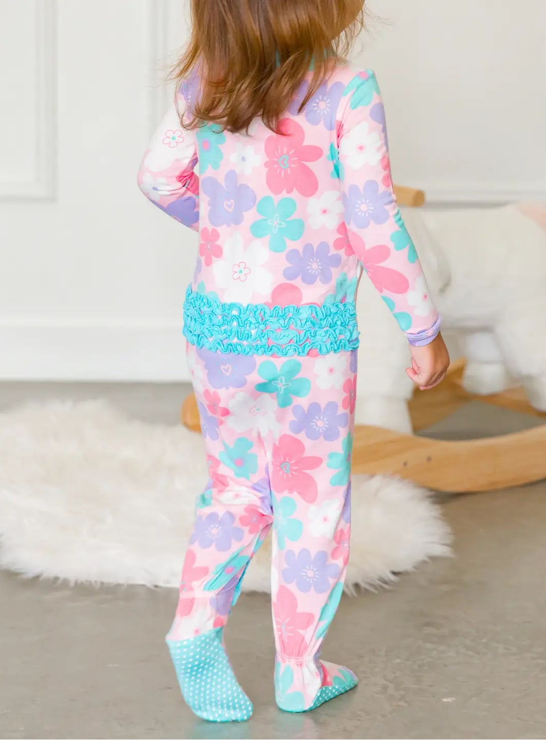 This ruffled sleeper is soft and cozy on baby's skin, with precious ruffles that will bring a smile to your face. A two-way zipper makes changing a breeze, so everyone can get the best night's rest. Foldover mitts on Newborn and 0-3m sizes. Made from our brand new SoftSnooze™ bamboo viscose! Designed to grow with your little one, SoftSnooze™ bamboo viscose fabric is super snuggly, breathable, and made for sensitive skin. Perfect for keeping cozy in the winter yet cool in the summer.