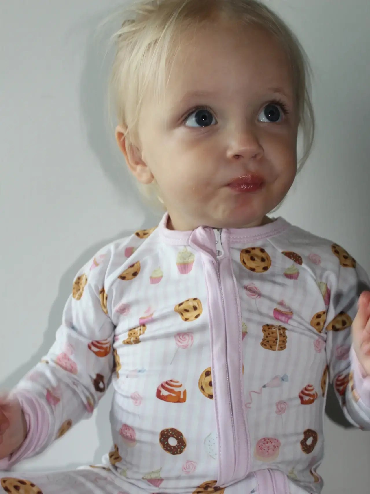 YUM! Just don't eat the baby. They will look so scrumptious in this adorable Sweet Treats Bamboo Romper. This pink stripe perfection has the yummiest treats - cookies, cinnamon rolls, doughnuts, cupcakes, icing, yum yum! This romper features our ultra soft bamboo fabric as well as: