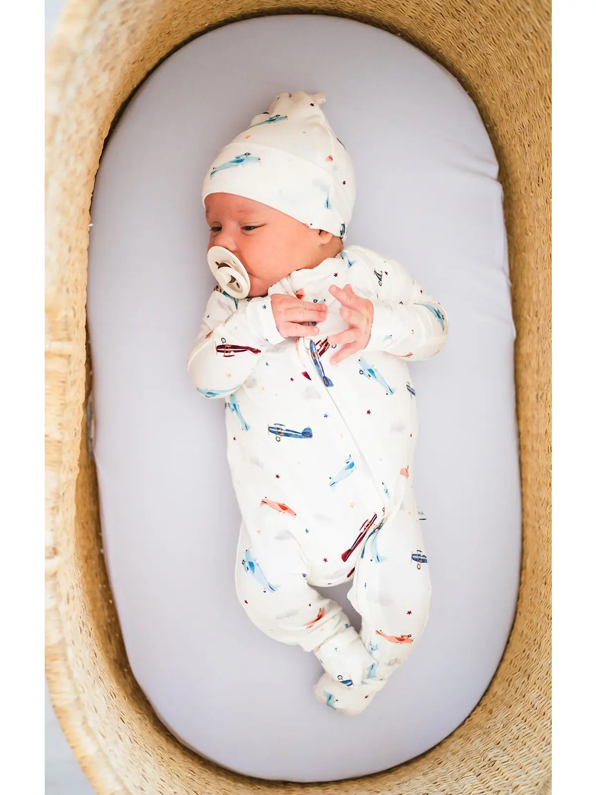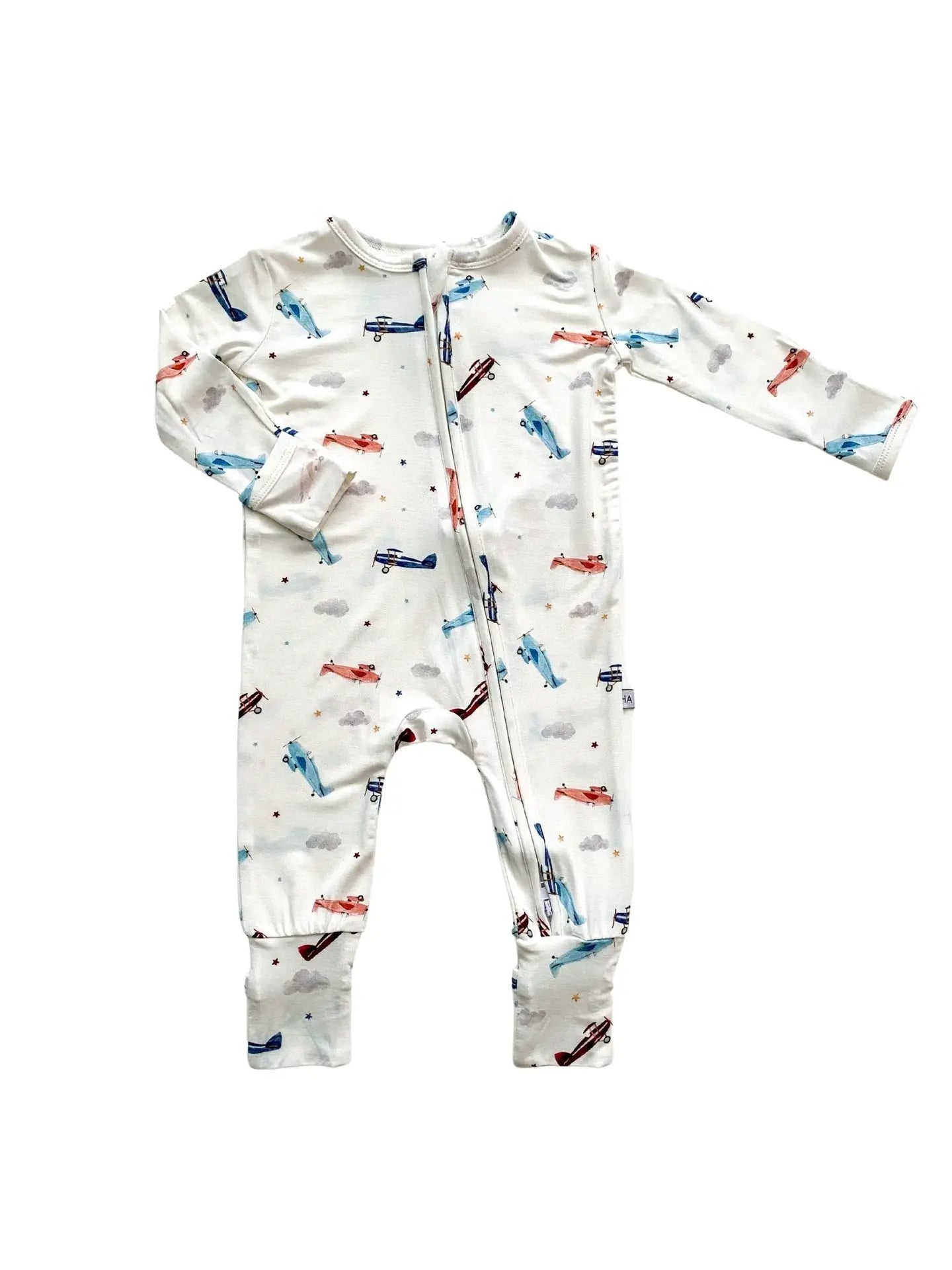 This soft and snuggly vintage airplane zipper romper from Harp Angel Boutique makes the perfect going home outfit or gift. Made from bamboo viscose, which is lightweight and ultra-soft. Features a 2-way zipper that runs from the neck to the ankle to make those diaper changes super easy! Featuring fold over cuffs (newborn and 0-3 month sizes only) to keep baby from scratching and to keep their little hands warm. *hat not included